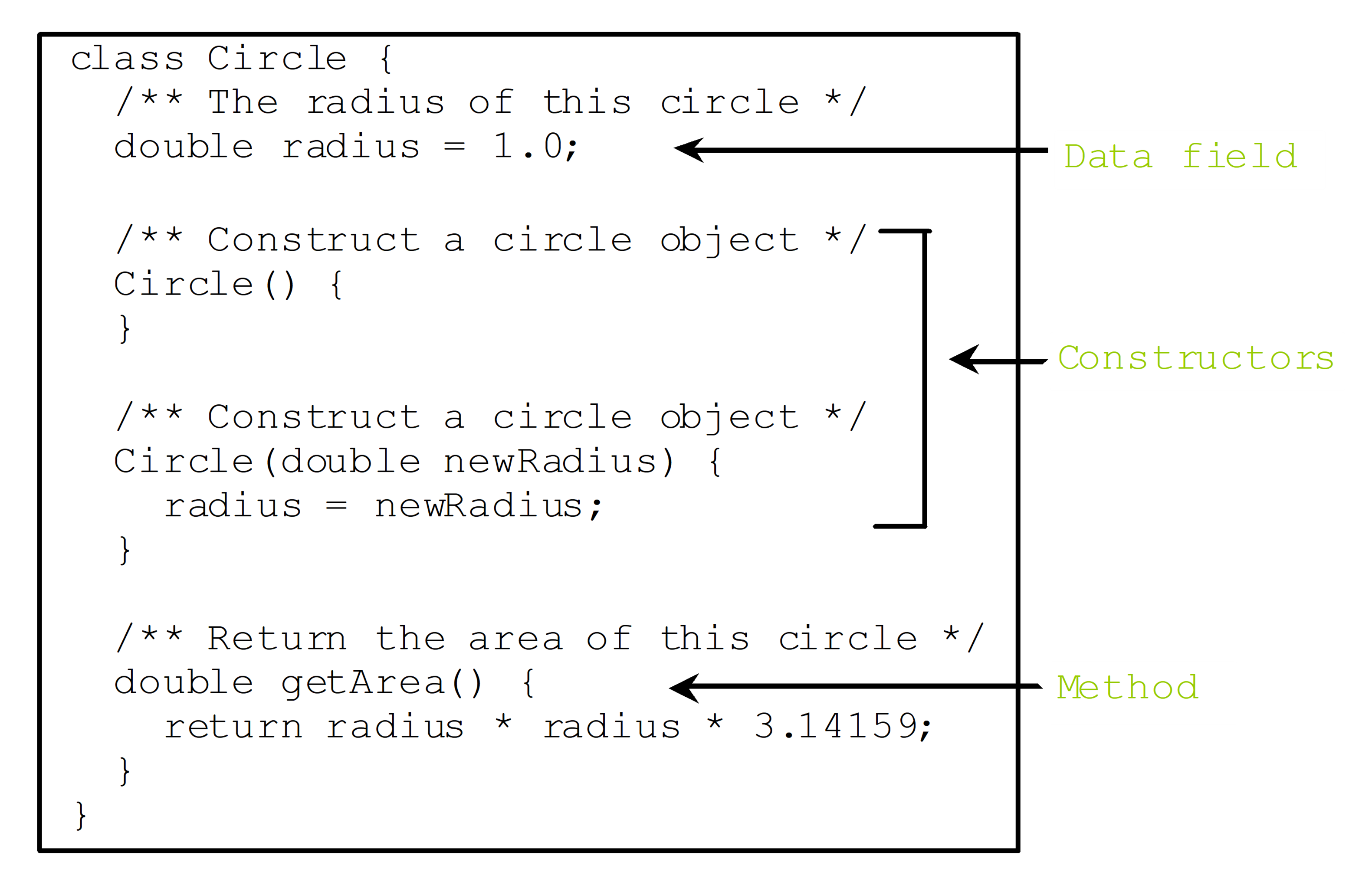 Classes are constructs that define objects of the same type. A Java class uses variables to define data fields and methods to define behaviors. Additionally, a class provides a special type of methods, known as constructors, which are invoked to construct objects from the class.
